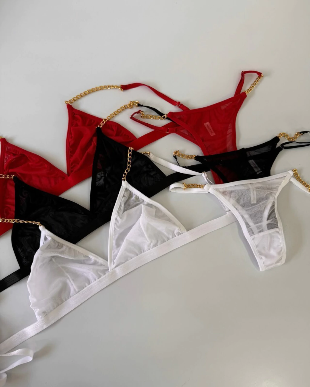 Esse conjunto é a combinação perfeita de sensualidade e modernidade! O sutiã possui um design arrojado com detalhes em corrente que valorizam o seu decote, enquanto a calcinha se ajusta confortavelmente ao corpo, realçando suas curvas de forma incrível. Feito em microfibra com toque macio, é ideal para quem quer se sentir sexy, poderosa e confiante. Tecido confeccionado em tule transparente..