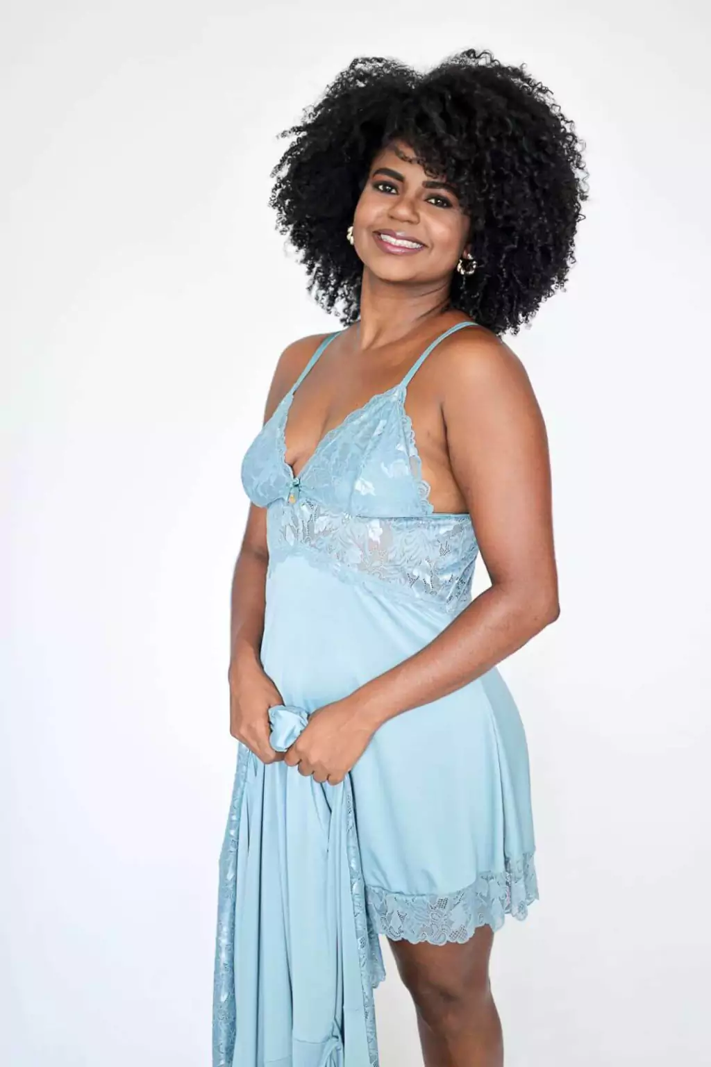 O Conjunto Hobe + Camisola + Calcinha é um belo conjunto confeccionado com tecido de liganete, super fresco e com ótimo caimento, é um conjunto que representa elegância em todas as ocasiões, podendo ser usados juntos ou separadamente. São peças perfeitas para as estações mais quentes do ano, pois seu tecido tem toque macio, gelado, além de compor com a delicadeza e maciez das rendas dando um toque de sensualidade.