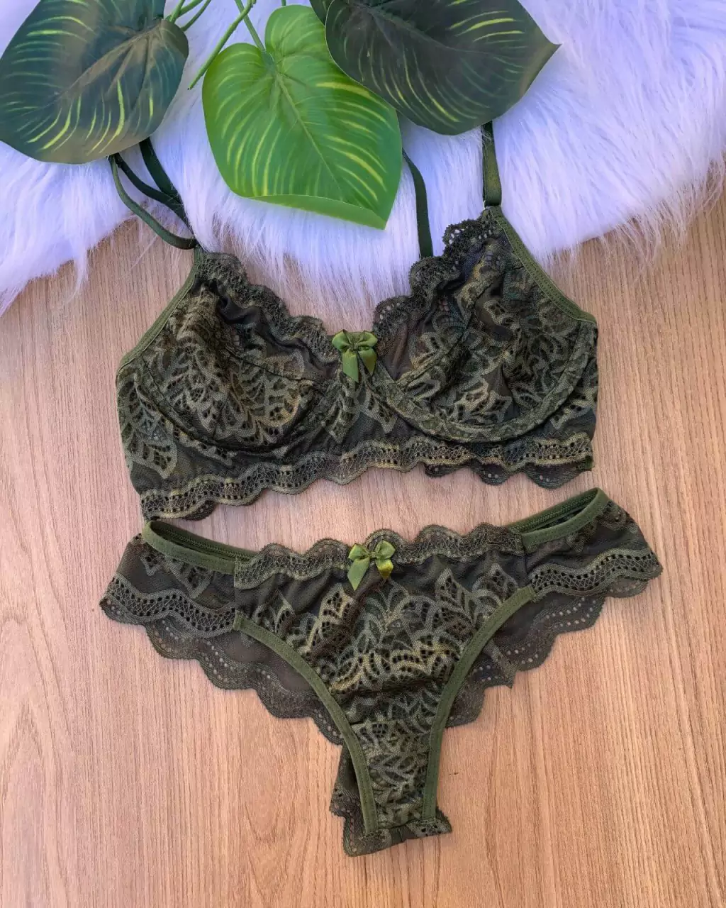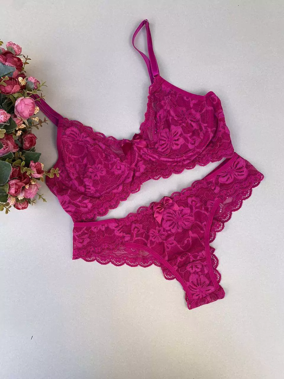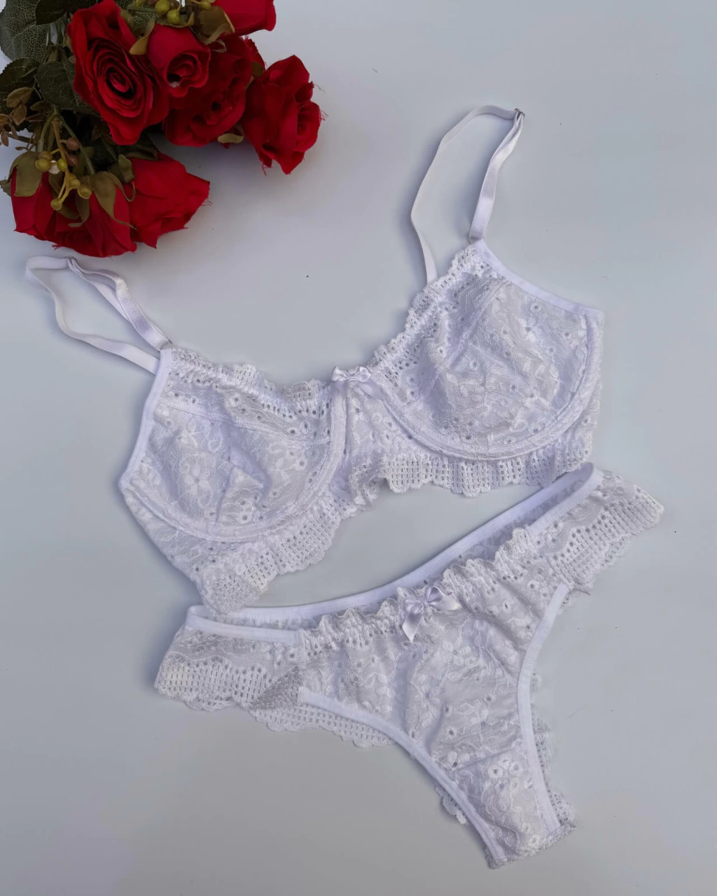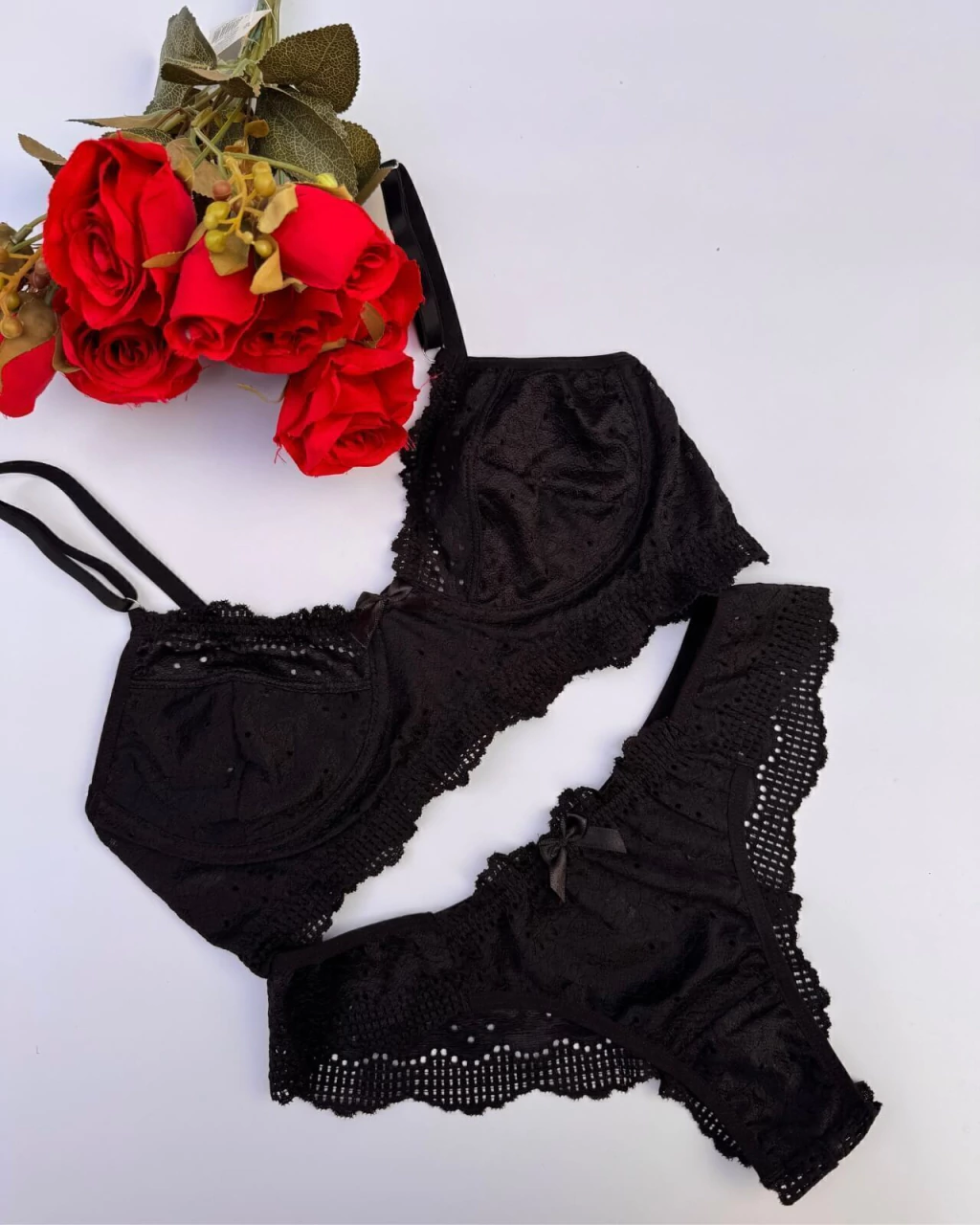 Conjunto lingerie feminino calcinha e sutiã em renda Soraya. Confeccionado em renda, tecido leve e confortável. Com forro 100% algodão e laço frontal.