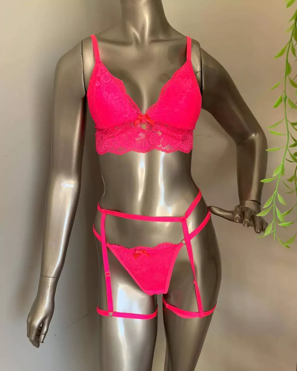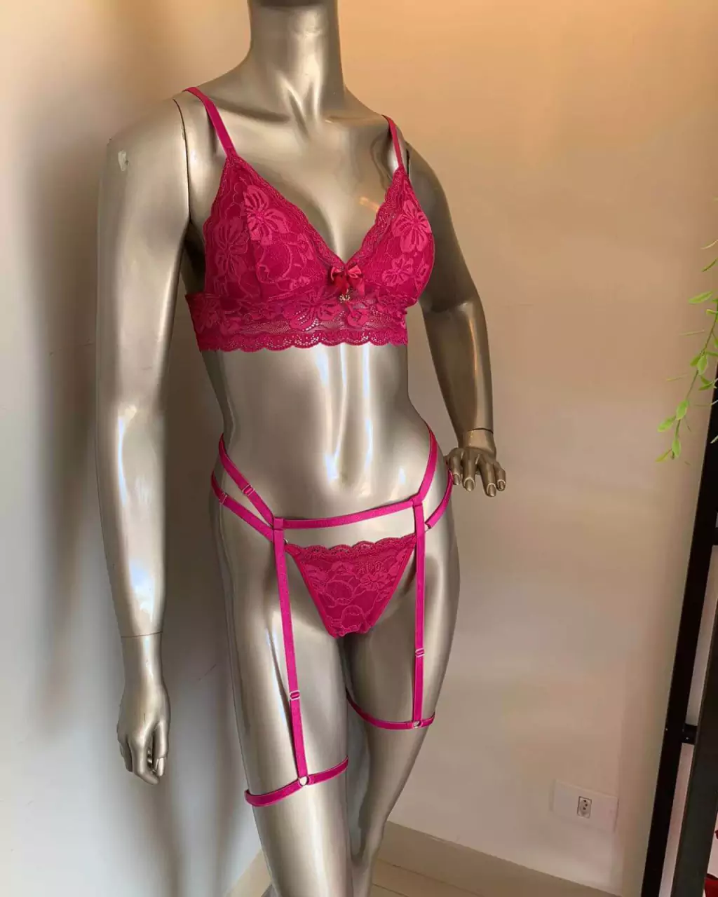 Explore a sensualidade com nosso Conjunto Sensual de Lingerie Silvana com 3 peças e realce ainda mais sua beleza. Este conjunto inclui um sutiã top sem bojo que sustenta suavemente seus seios, uma calcinha fio duplo com regulagem nas laterais para um caimento perfeito. Acompanha uma liga ajustável, que adiciona um toque extra de charme e sofisticação, tornando seu look ainda mais sexy.
