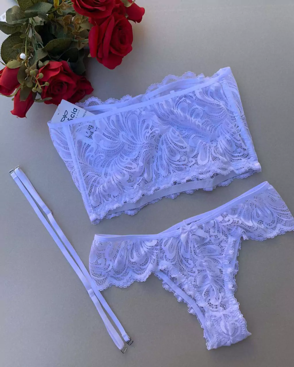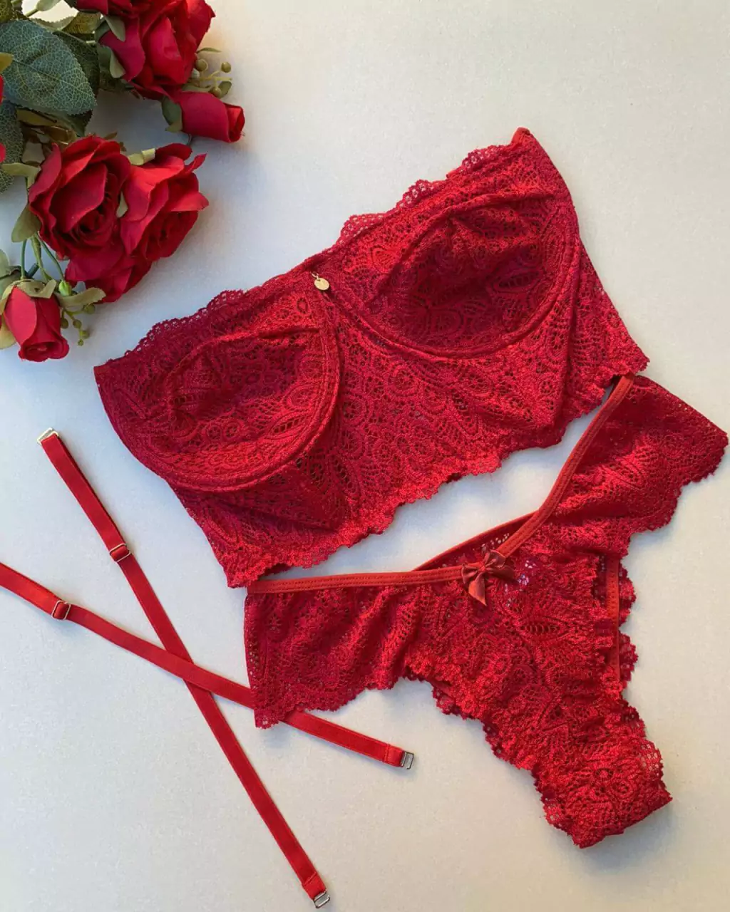 Nosso Conjunto de Lingerie é uma adição encantadora à sua coleção íntima. Composto por calcinha e cropped em renda delicada, este conjunto combina elegância e sensualidade de forma perfeita.